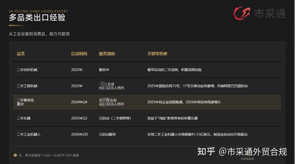 答案很简单:二手货出口,尤其是二奢和工程机械这类高价值、高复杂度的品类,对试点的专业度、政策理解深度和全链路服务能力要求极高,而市采通在这些方面几乎无可替代。